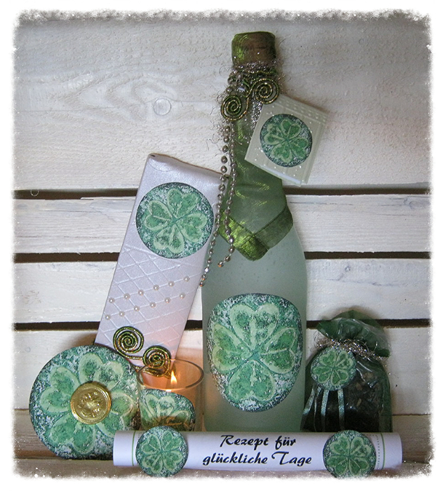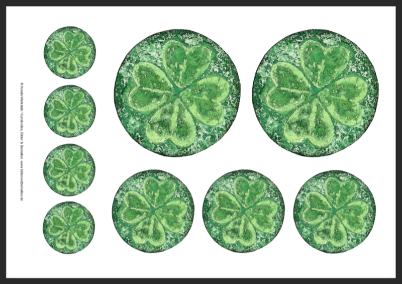 Vorlage ausdrucken, einzelne Kleeblattkreise ausschneiden und je nach Verwendung mit etwas Klebstoff anbringen (Anwendungsbeispiele siehe unten).