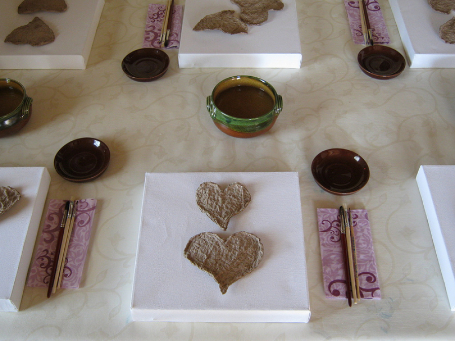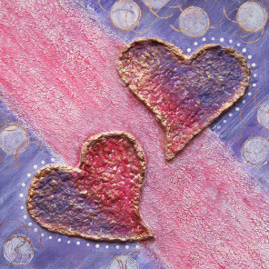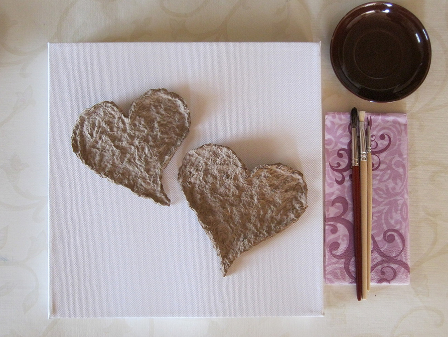 Diese kleinen quadratischen Leinwände mit den Maßen 25 x 25 x 4cm eignen sich hervorragend für eine kleine Farbspielerei. Die beiden Herzen aus selbsthergestellter Pappmaché werden nach Belieben angeordnet. Wie von selbst ergeben sich dadurch die Gestaltungsmöglichkeiten.
