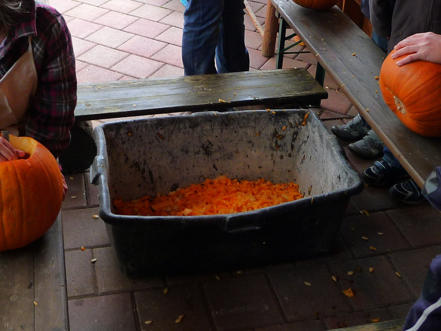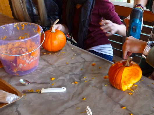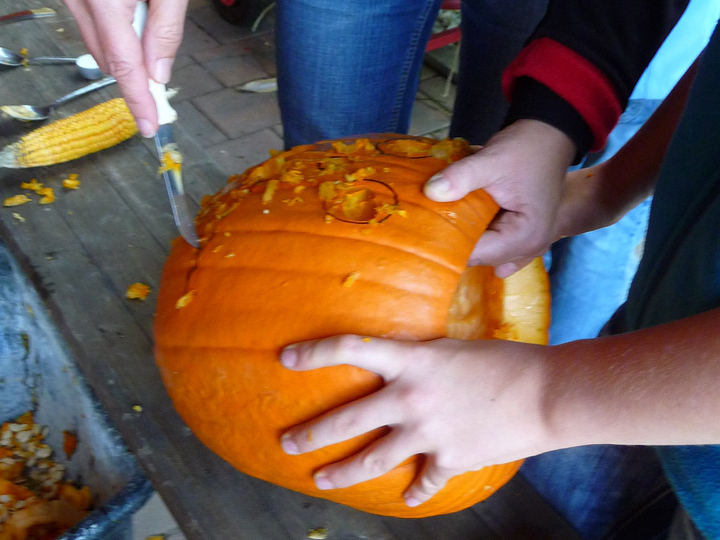 Hinweis: In einem derart verziertem Kürbis ein Teelicht mit Batterie zum Dauergebrauch verwenden! Sobald der natürliche Zersetzungsprozeß einsetzt, löst sich der Deckel vom Kürbis (Brandgefahr bei normalen Teelichtgebrauch).