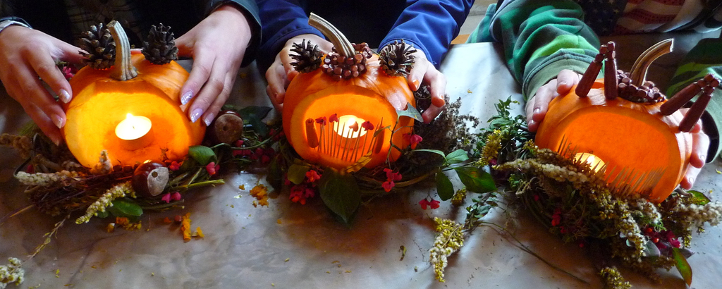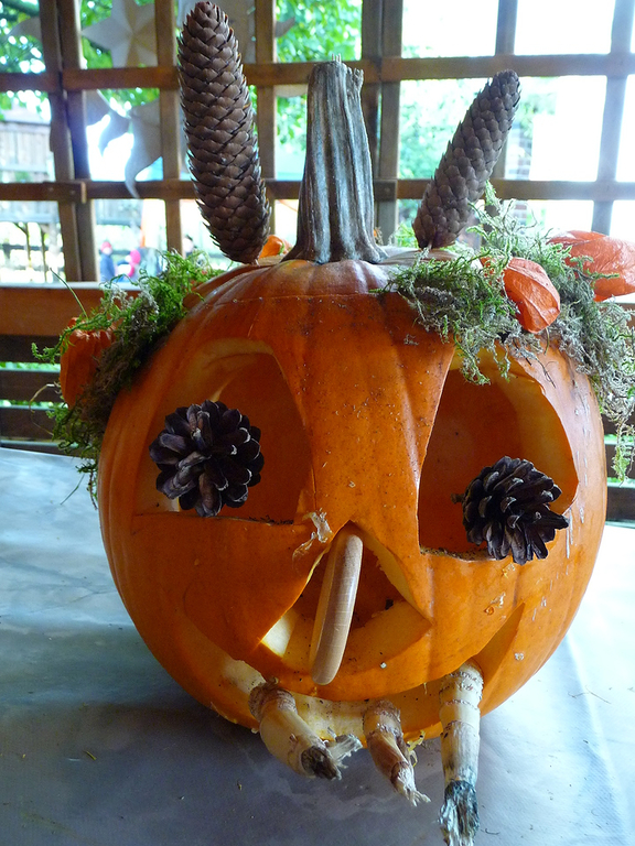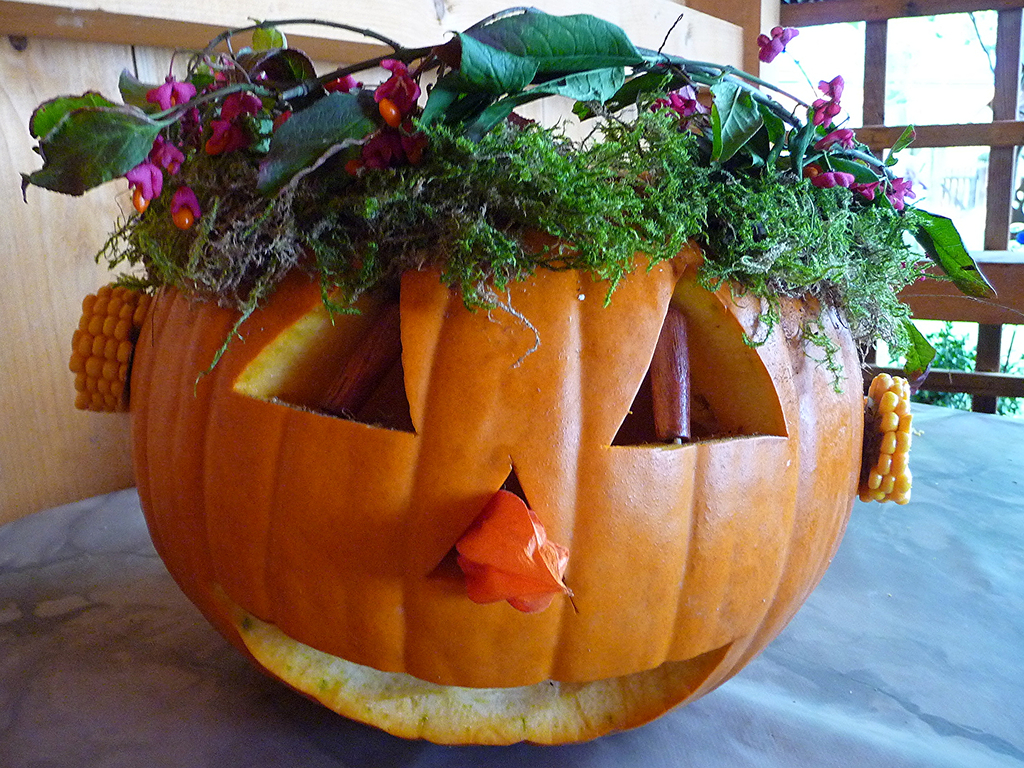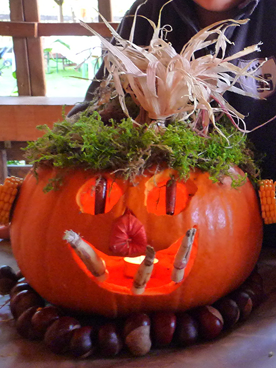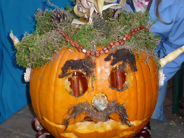 Ein Kürbis wird besonders originell, wenn er Verzierungen wie Augen, Nase, Ohren, Haare, Zähne oder sogar eine Zunge aus verschiedenen Naturmaterialien bekommt. Sammelt hierfür Tannen- oder Fichtenzapfen, Blätter von Maisstauden, flache Steine, Moos, Kastanien oder Ähnliches.