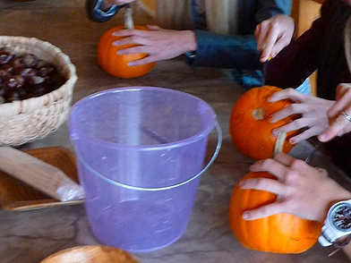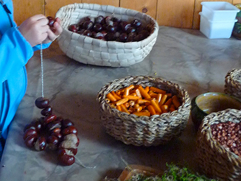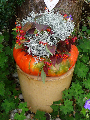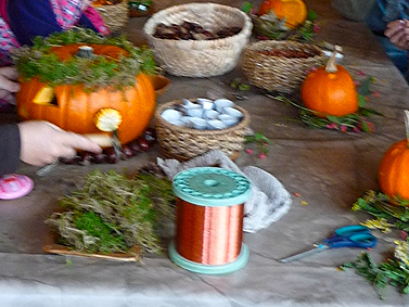 Und besonders hübsch sieht es aus, wenn ihr zum Schluß einen Kranz aus Herbstzweigen bindet oder eine Kette aus Kastanien fädelt und euren Kürbis darauf stellt.