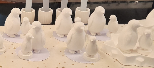 Bemalbar mit Acryl- oder Wasserfarben. Am besten verdünnte Farbe(n) in mehreren Schichten bzw. Farbtönen auftragen und evtl. mit geeignetem Lack überziehen. Augen bei den Pinguinen können auch mit einem dünnen Filzstift oder Fineliner bemalt werden, wenn kein feiner Pinsel vorhanden ist.